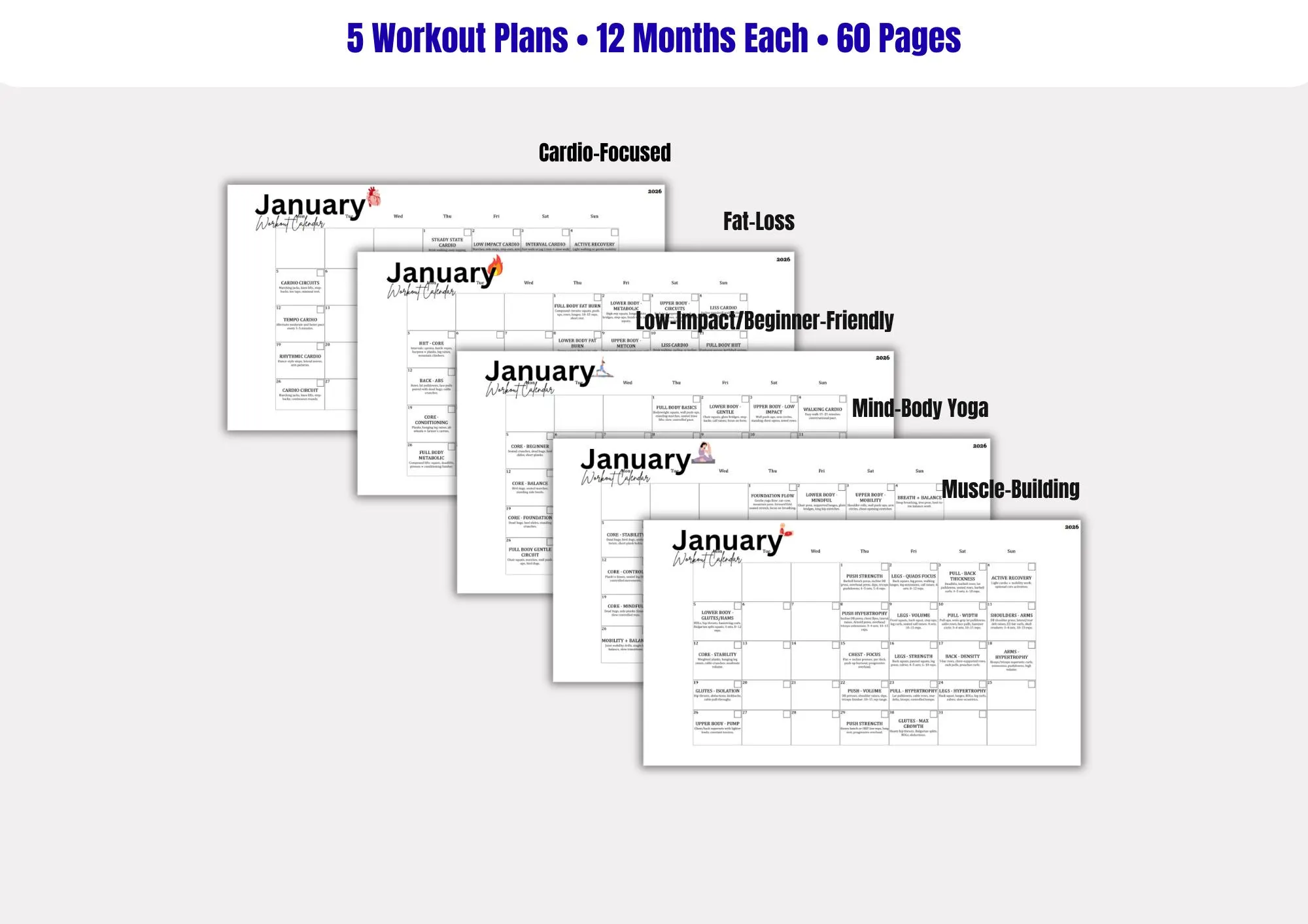 Each calendar clearly outlines daily workouts for every month, making it easy to follow, track progress, and stay motivated year-round.
