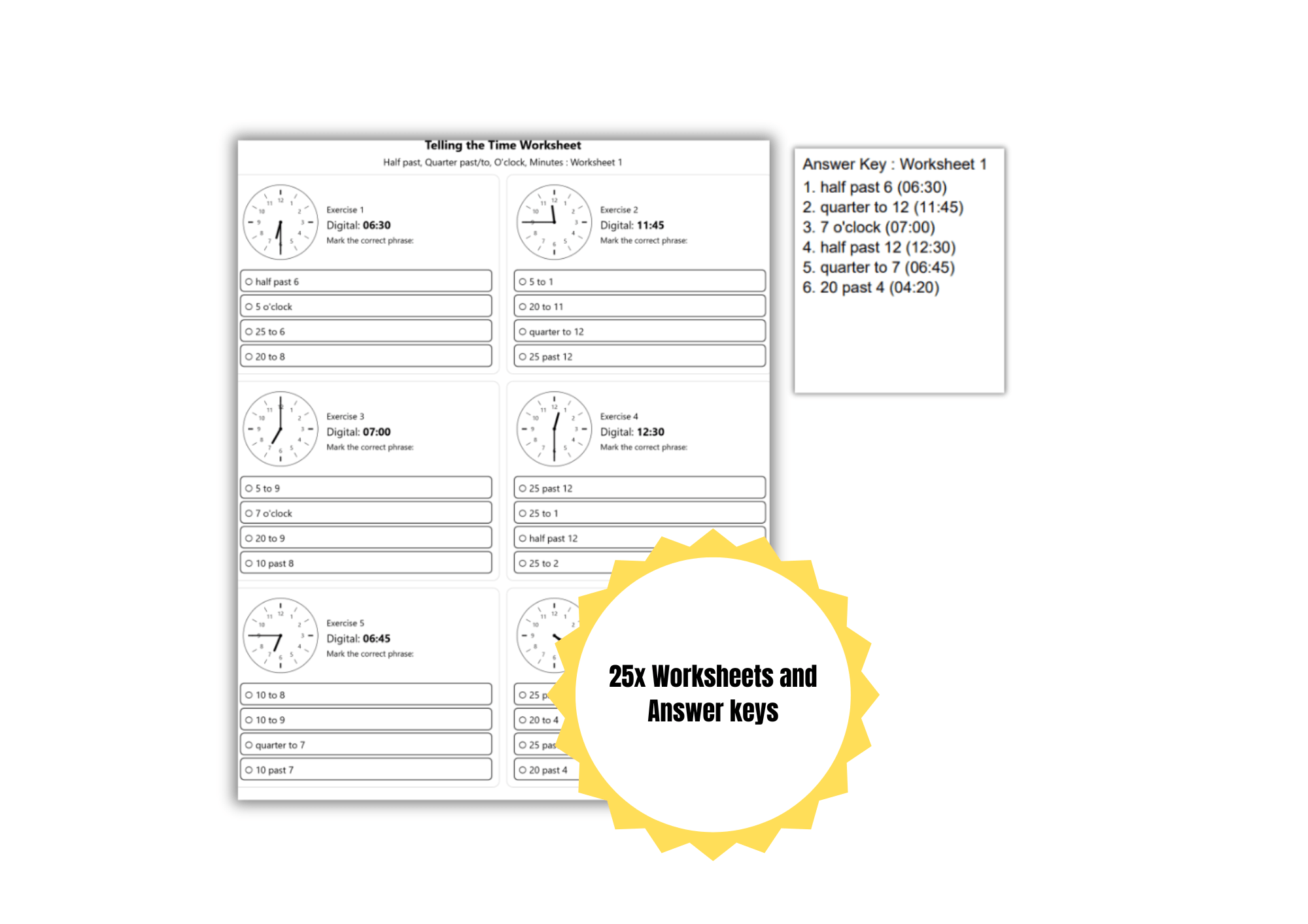 This Telling the Time Worksheets Bundle includes 25 printable worksheets with full answer keys, designed to help children read analog and digital clocks using common time phrases.